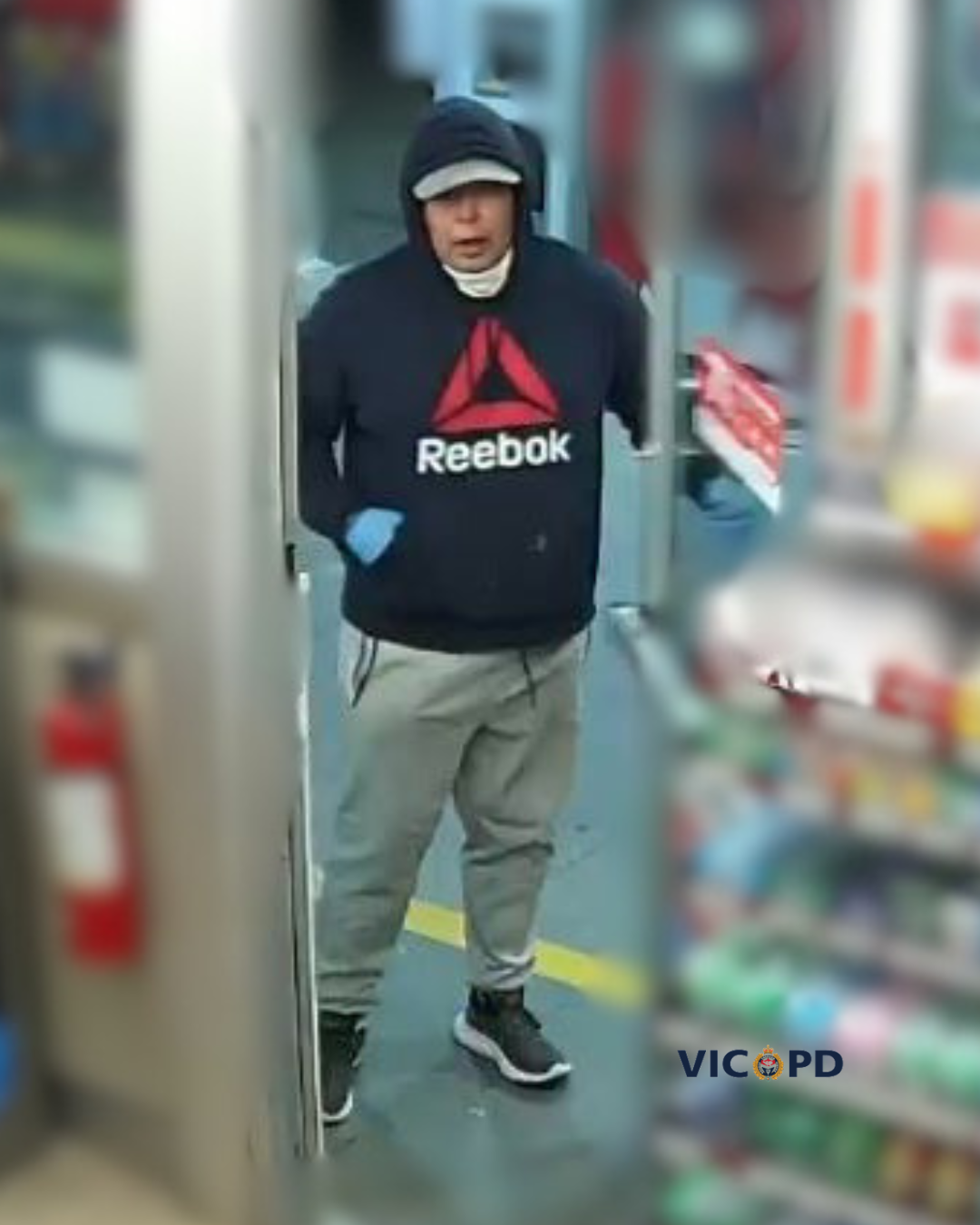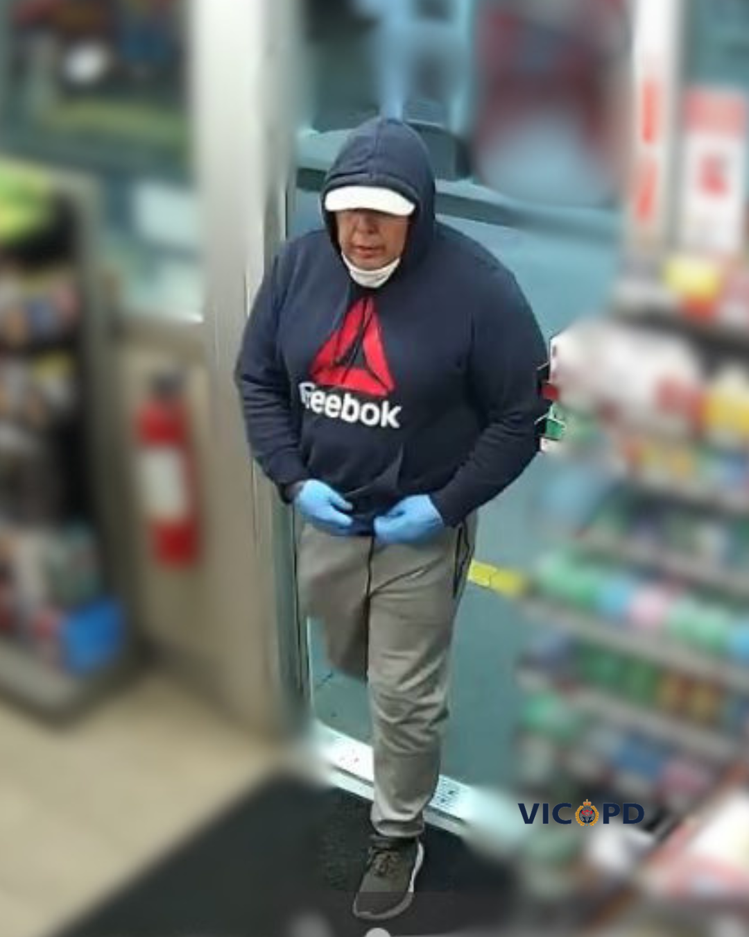 VicPD is sharing the following surveillance images hoping you can identify him. He’s wearing a white baseball cap, blue sweater with a red Reebok symbol, grey pants, and blue latex gloves.